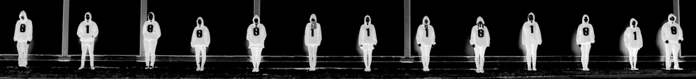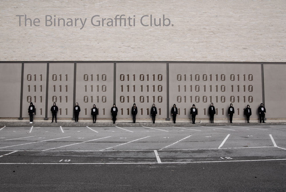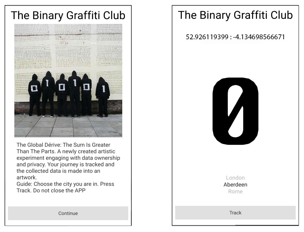 Often during this performative event volunteers wear hoodies and become the "The Binary Graffiti Club" as a group happening and these can be tracked in the city. They are monitored and surveyed and the collected data is used to visualise them on large screens in the city or gallery