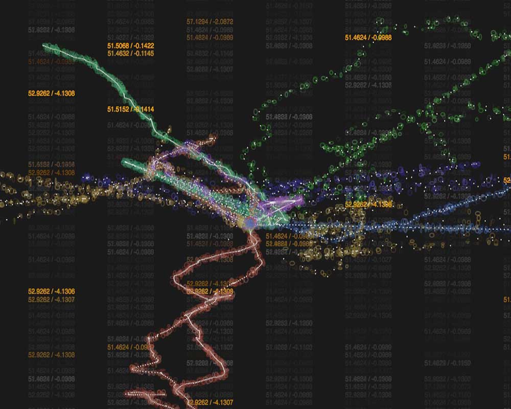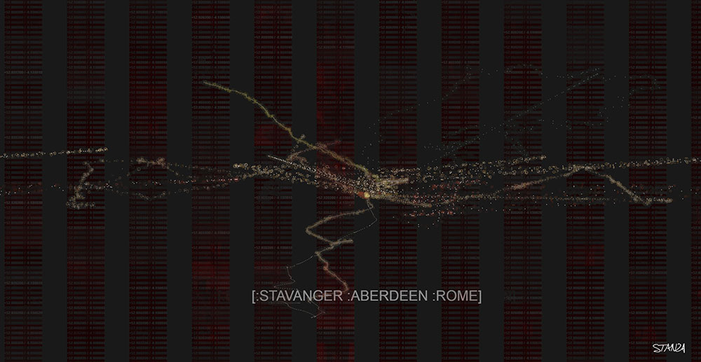 The result is realized as a visualization and seen by the public on large screens in real time. The GPS positions and images are fused into an abstracted visual experience. Historical data from the other walks and cities is also fused into the artwork.