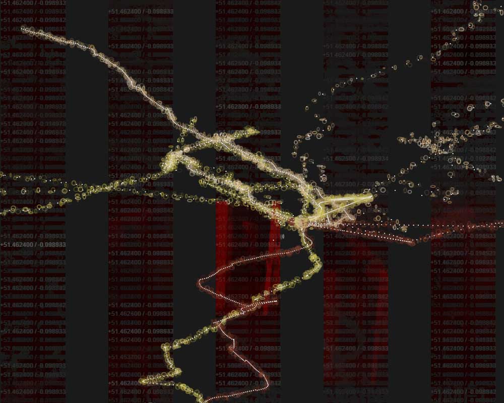 This is a piece of software that allows anyone participating to be tracked and visualised and become part of the artwork. Volunteers can be anywhere from 10 to 1000 or more people can can part of the artwork at once. The Global Derive, is a newly created artistic artwork engaging with issues of data ownership, privacy of information within the real time city.